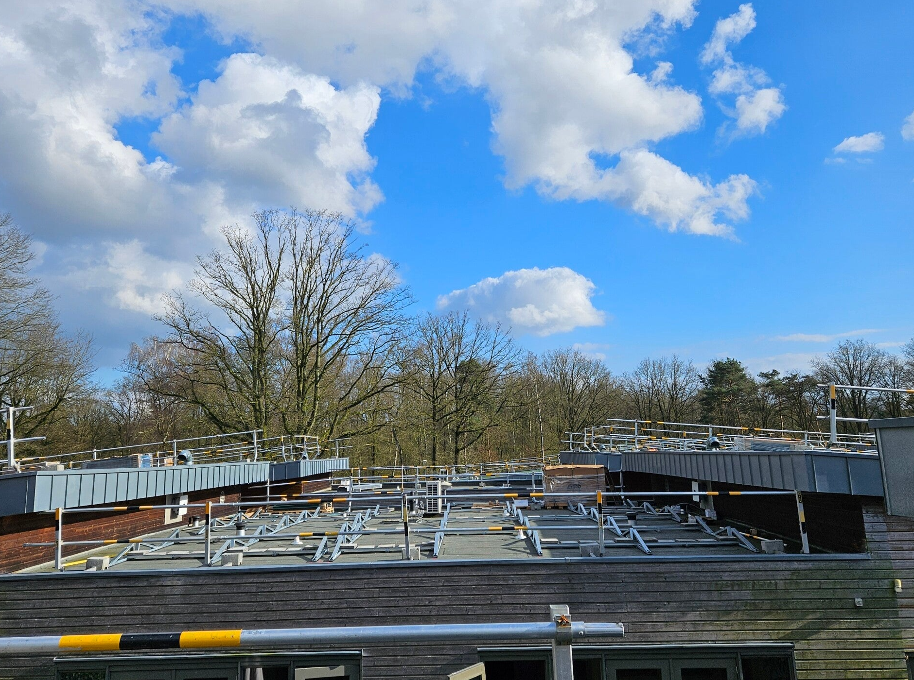 Ook hier draait alles om Maatwerk. De dakhaken worden geschroefd door de bitumen laag, door de isolatie en dan in de dakplaten. Vervolgens word er met behulp van een Dakdekker stukken bitumen over de schroefpunten gebrand om waterdichtheid te kunnen bieden.